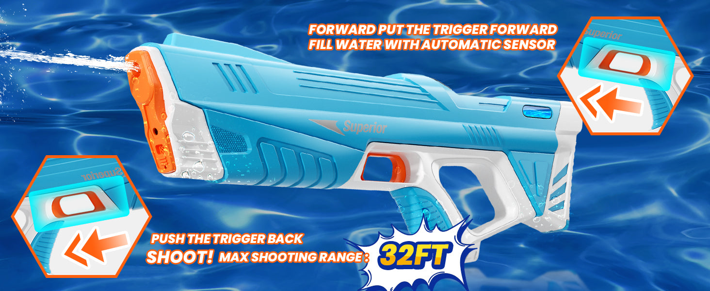 - π Ideal Gift for Summer electric water gun is perfect for swimming pool, patio, beach, party, family entertainment and outdoor activities. Ideal gift choice for boys and girls over 8 years old for birthday or summer vacation.